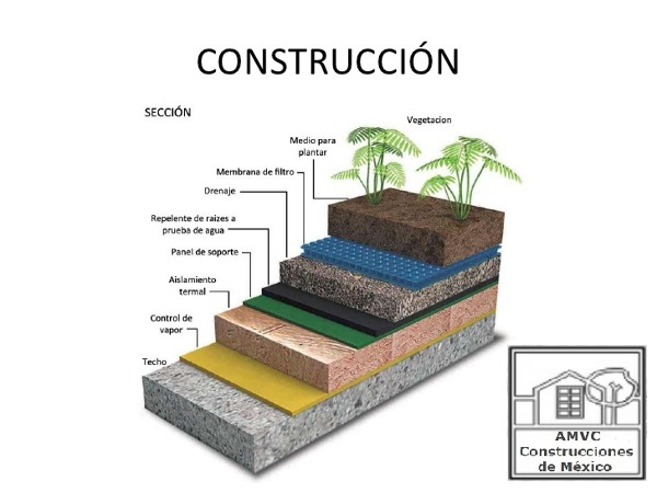 Es una losa de concreto con tratamiento impermeable con el siguiente procedimiento: tratamiento de losa, después se le coloca un sistema impermeabilizante prefabricado, y ya después se coloca un filtro tezontle, la tierra vegetal y por último el pasto y/o planta.
